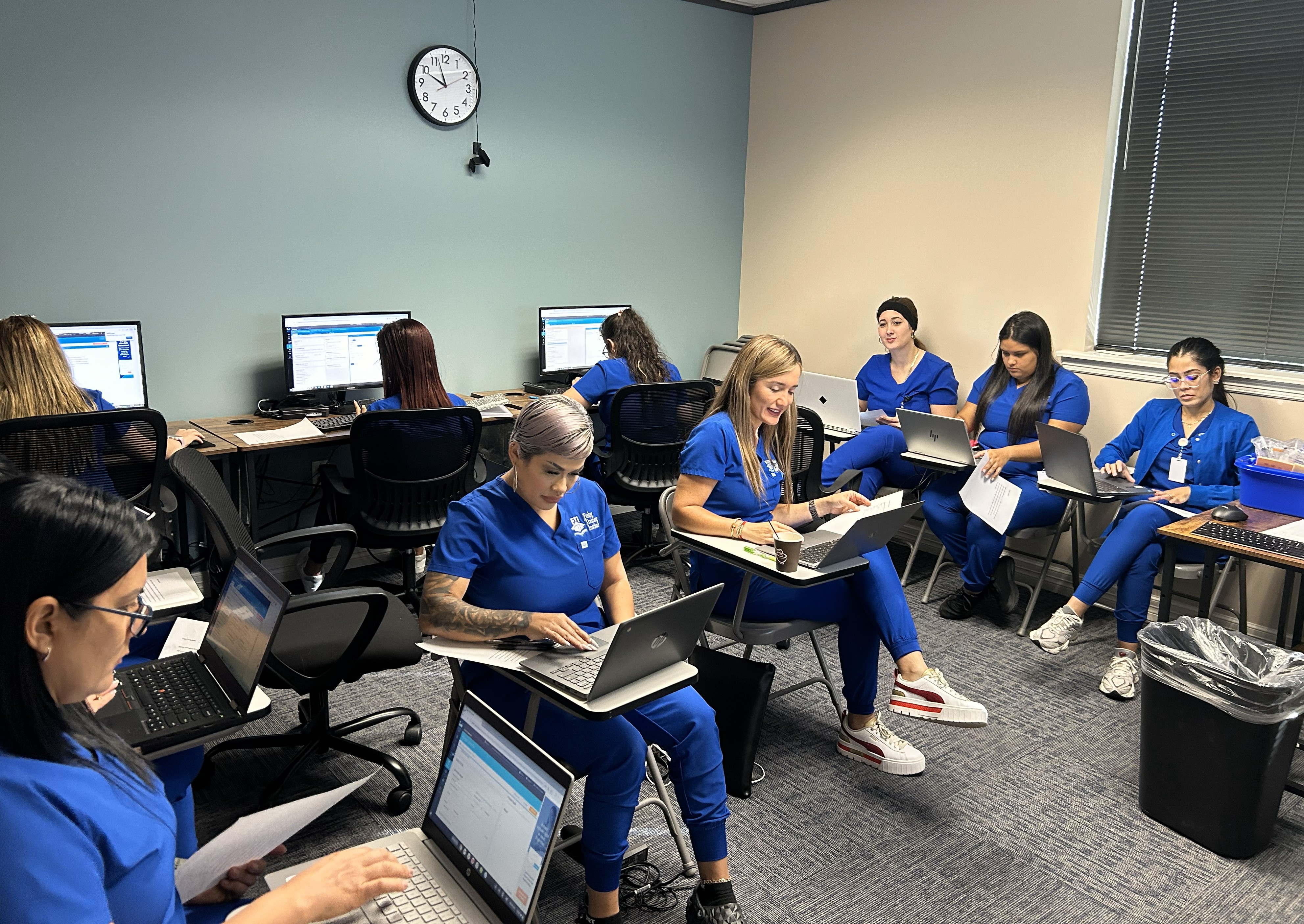 Los estudiantes reciben acceso 24/7 a cuestionarios, exámenes de práctica, videos de entrenamiento, grabaciones de clases, lecciones interactivas, sistemas de práctica EMR, tareas y materiales de estudio — todo en un solo lugar.